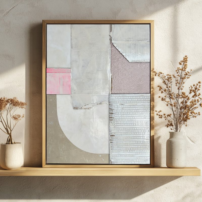 Unieke papier/karton collage in lichte naturel tinten met roze accent.
